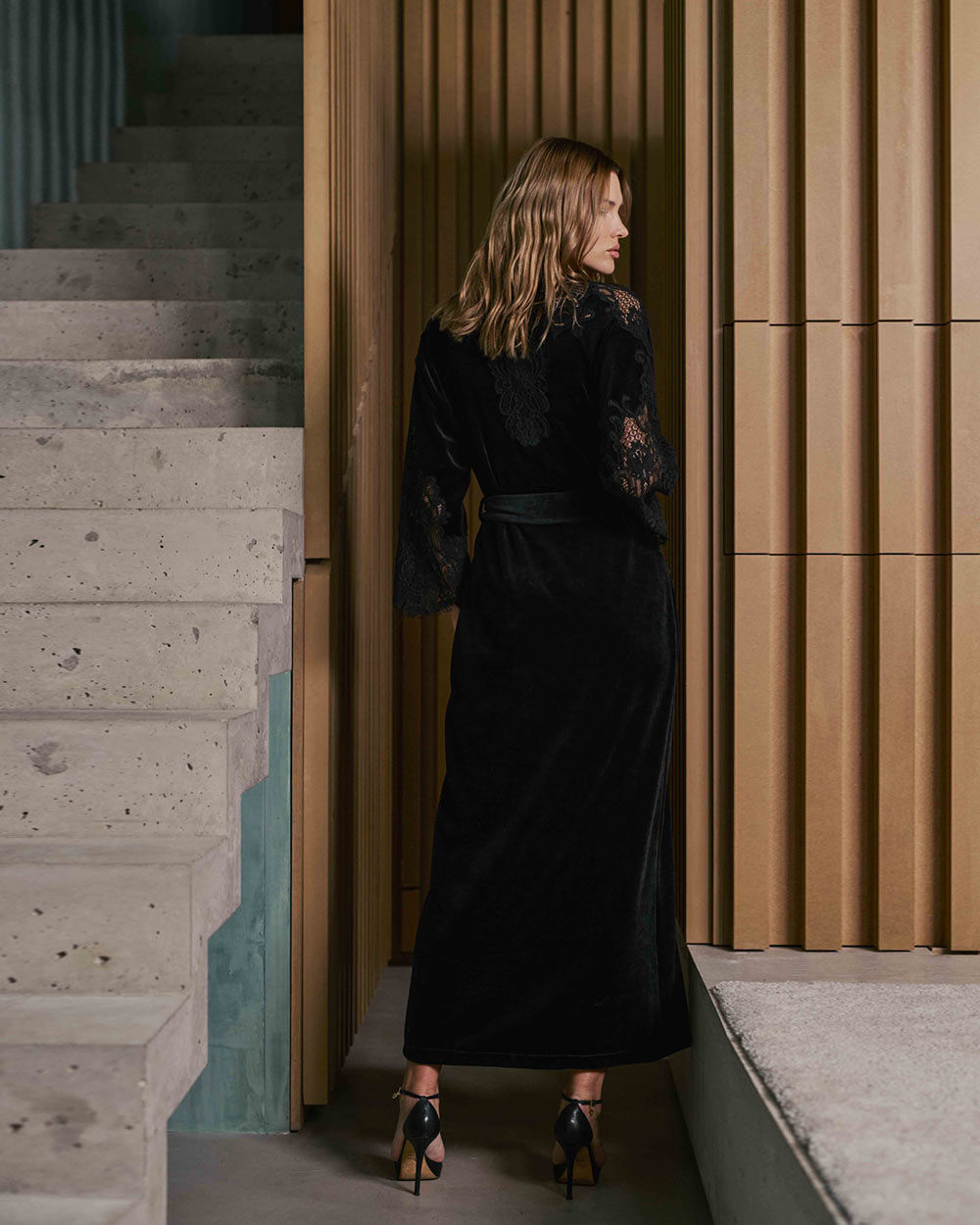 Marjolaine has embodied French sensuality and refinement since the 1930s, blending silk, velvet, and Calais lace with couture precision. The Branda long dressing gown is a striking example—crafted in sumptuous velvet and detailed with lace insets at the sleeves, shoulders, and neckline. Flowing, belted, and complete with pockets and embroidered back, it's elegance made effortless in black.