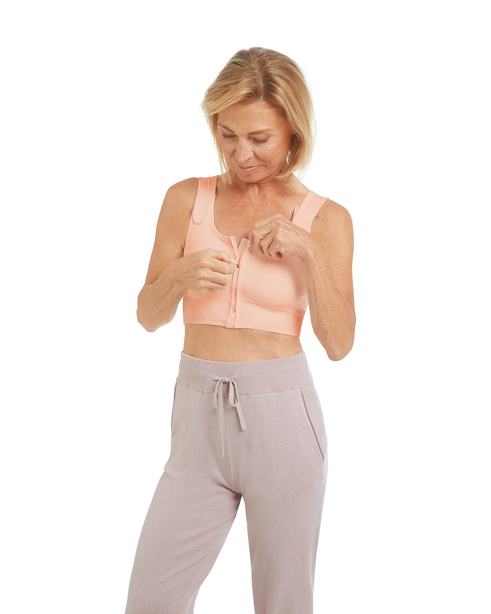For nearly five decades, Amoena has been an industry leader in breast care, using innovative technology to create the best bras, swimwear, and breast-symmetry products. Our new Pamela post-surgery seamless compression bra offers targeted support through zoning, with seamless technology for a precise fit. Adjustable straps, front zip closure, and soft materials ensure comfort, while special knitting zones aid in healing and stabilization.