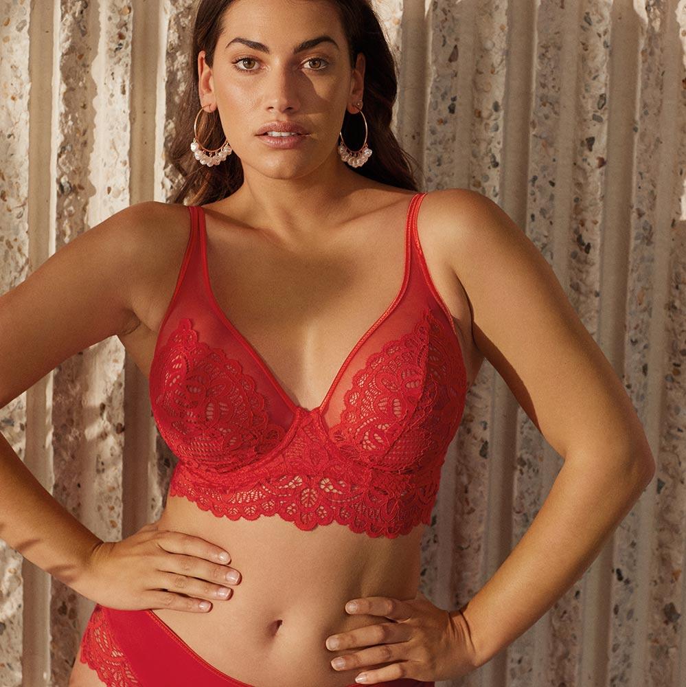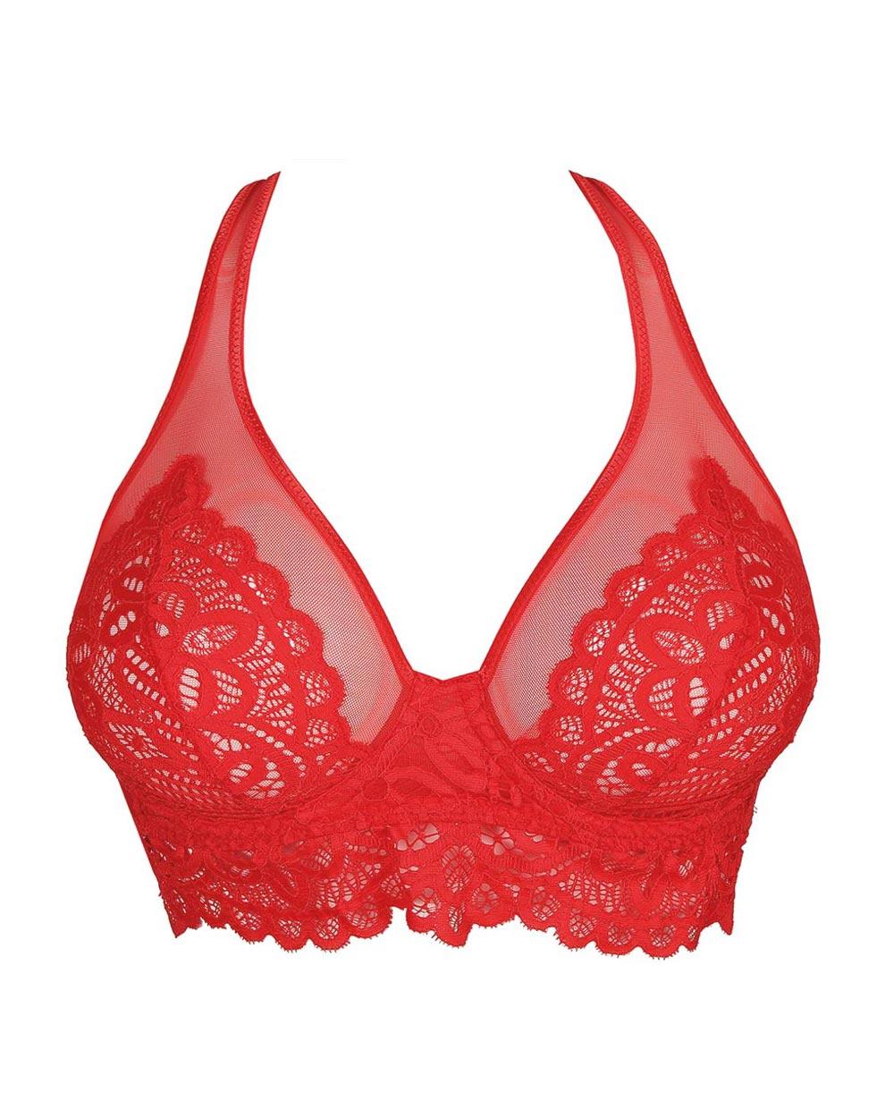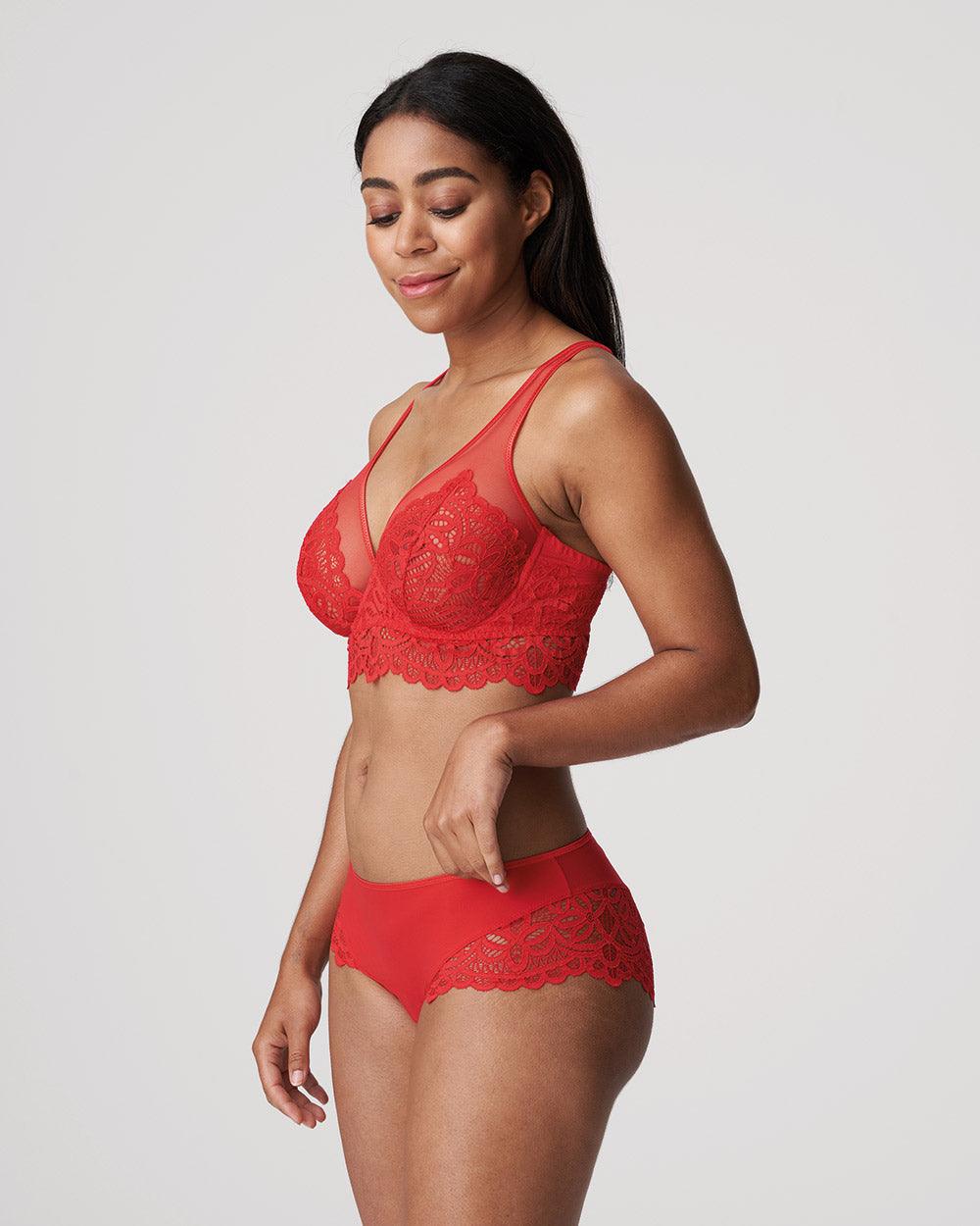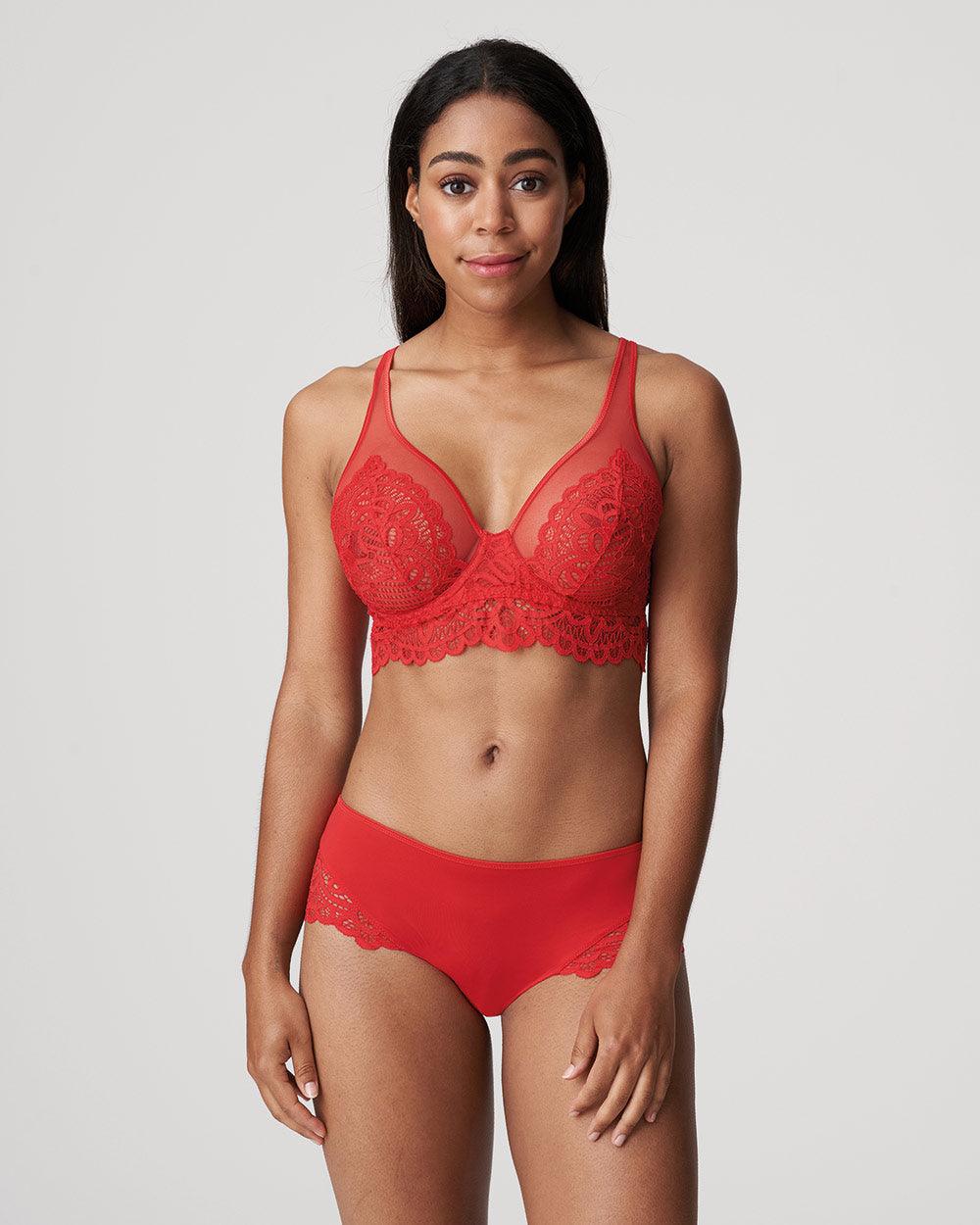 Searching for ultra-stylish lingerie made to support larger cup sizes? Bien sûr! The Prima Donna Twist First Night collection is about sexy lace and supreme comfort- available in head-turning candy red "pomme" color. This triangle bra fully covers the breasts and features stunning embroidery trim for a seductive effect..